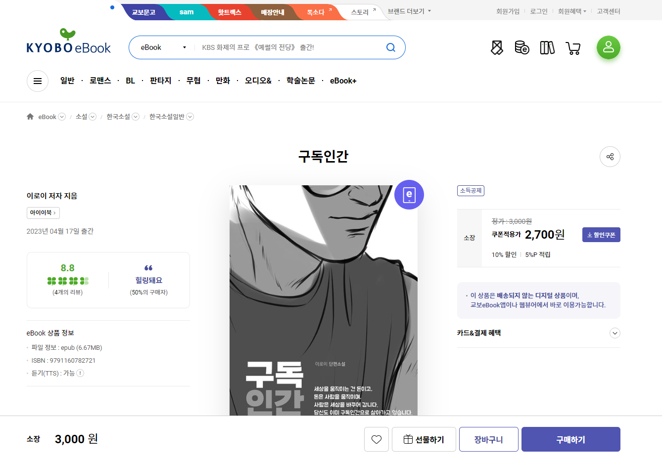 현재 <교보문고>, <리디북스>, <예스24>, <알라딘>, <원스토어 북스(원스토리)>에서 구매 가능하며